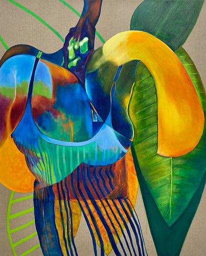 The bursts of colour and shapes in this series of paintings celebrate that moment of abandon, where body and food bond. The curved, plump, and glistening forms of the paintings are as much mouths, teeth and lips as they are fleshy pieces of fruit.